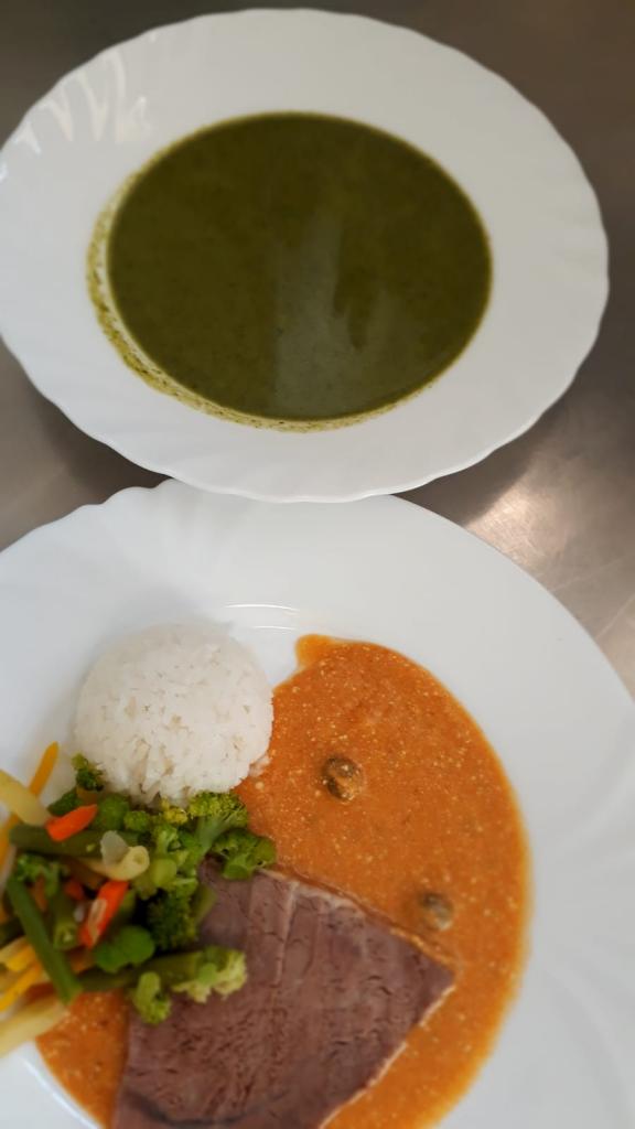 Špenátový krém. Pomalu pečené hovězí v silné cibulové omáčce, rýže a dušená zelenina