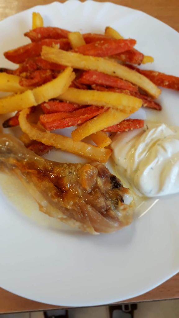 Pečené kuřátko, zeleninové hranolky a domácí tatarská omáčka