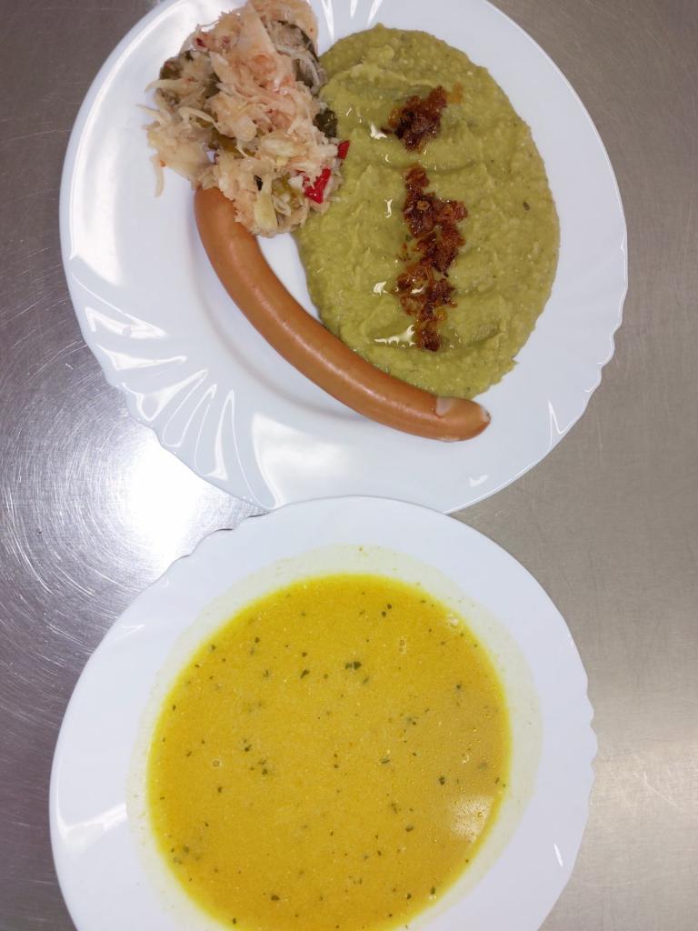 Dýňová polévka a hrachová kaše s cibulkou a párkem