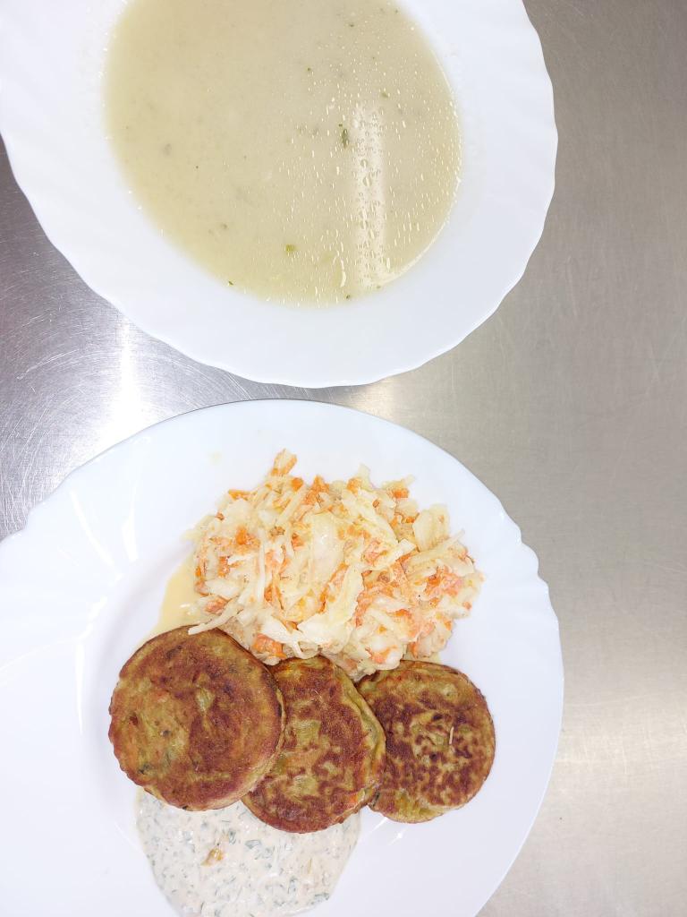 Květáková polévka, bramboráčky s cuketou, karotkou a paprikovým dipem.