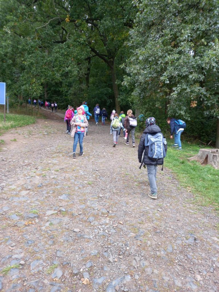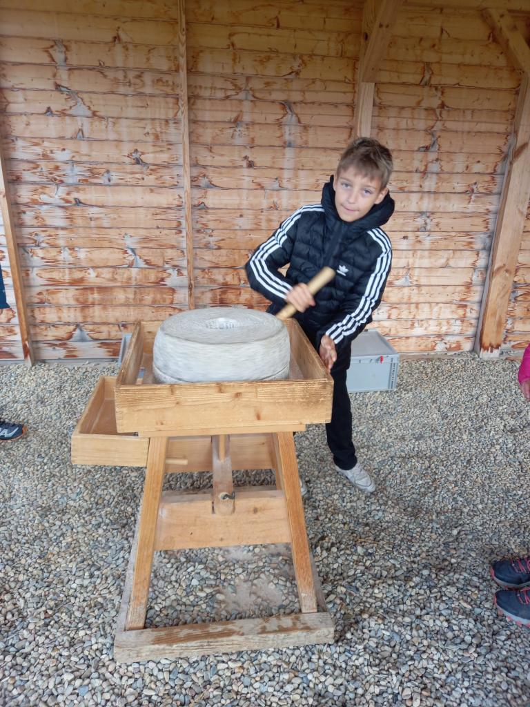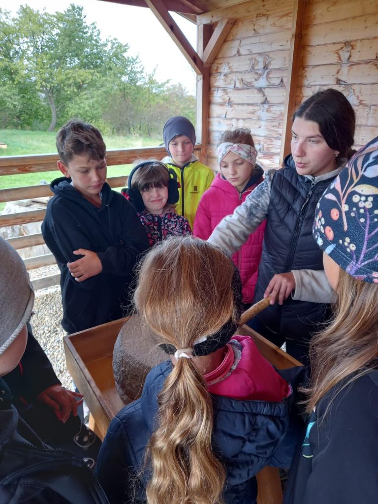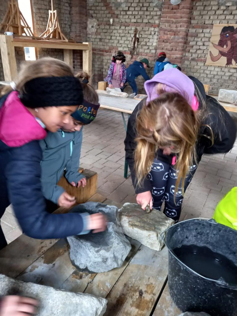 Čtvrtá a třetí třída jeli 1. října do Historyparku Ledčice. Mleli tam pšenici, vrtali díru do kamene a zkoušeli různá řemesla, třeba broušení kamene nebo tkaní. Potom šli na horu Říp. Bylo to stále do kopce a na vrcholu stála rotunda sv. Jiří a Vojtěcha z 11. století. Emma a Niky